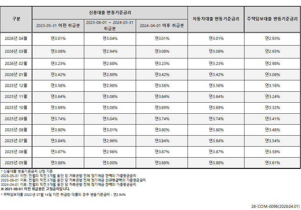 2026년 03월 변동 기준 금리 공시 안내
