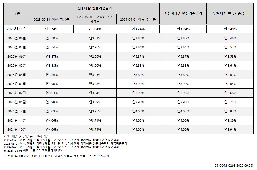 2025년 08월 변동 기준 금리 공시 안내